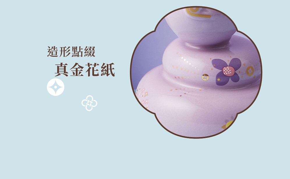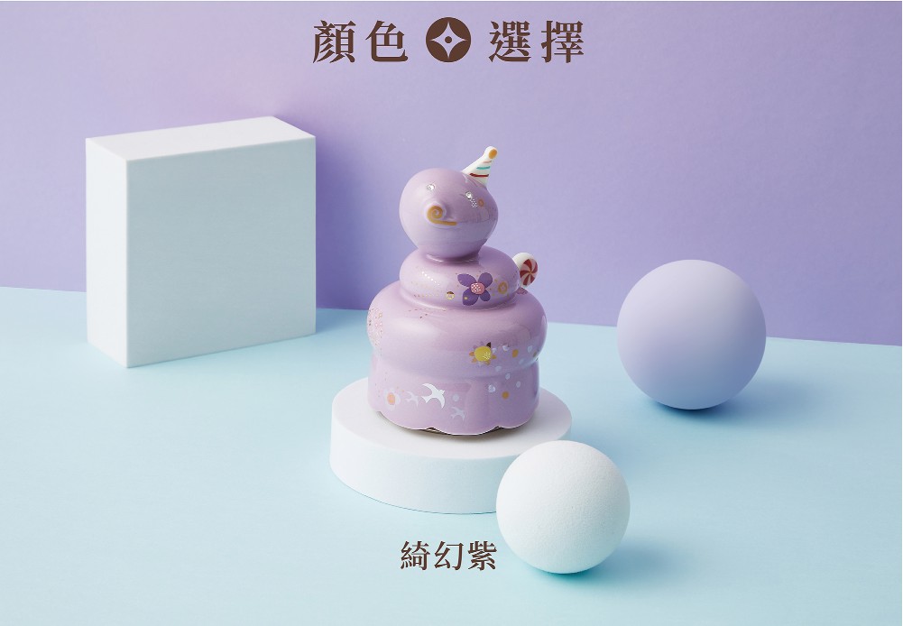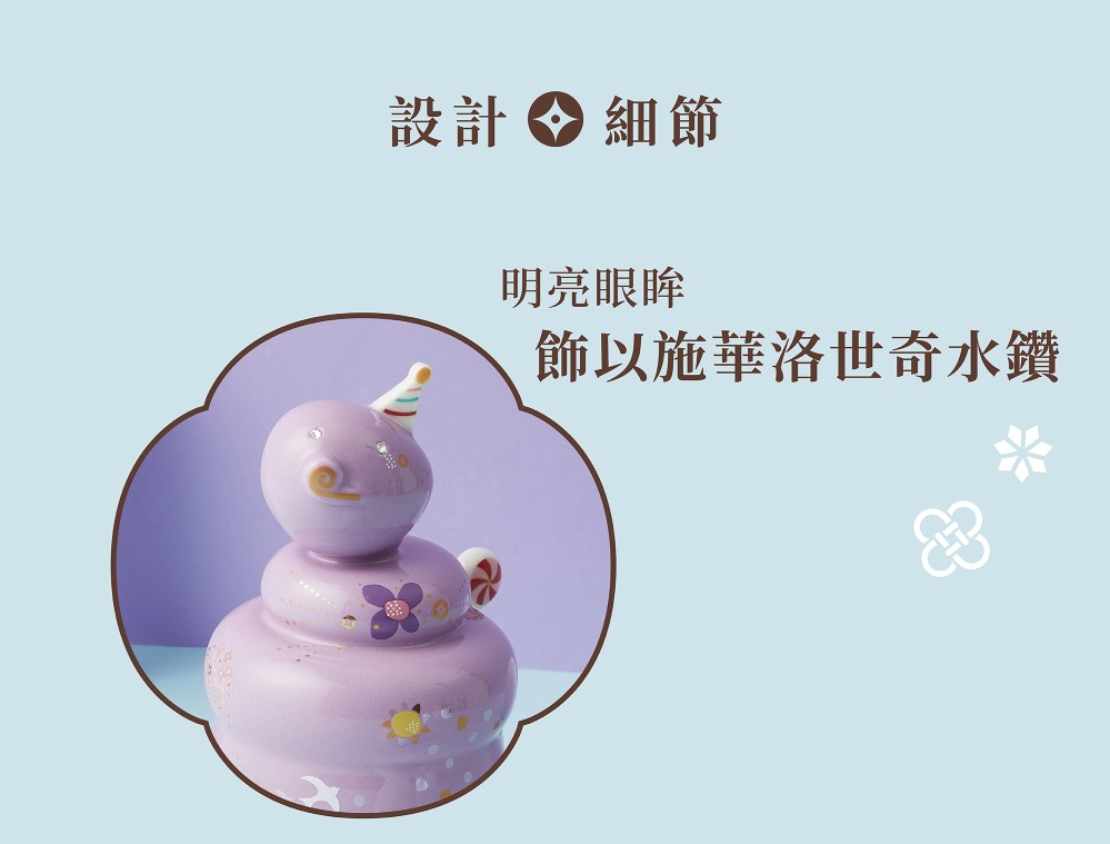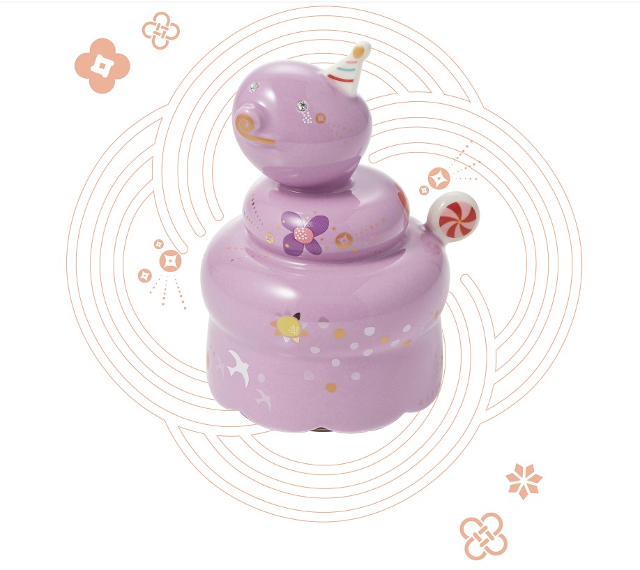 戴著歡樂帽盤旋起舞的靈蛇,造型有如融化人心的霜淇淋。以水鑽為眼睛,寓意穩賺;以童玩象鼻笛為蛇信,象徵吸財入庫;點綴花鳥金幣,代表飛來富貴;尾端繪飾棒棒糖如同音樂盒發條,轉動幸福旋律。